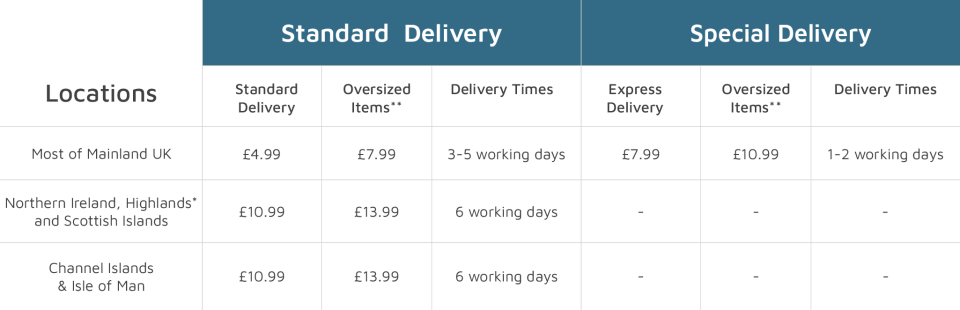 **Oversized items are automatically calculated with the delivery surcharge at checkout, in the catalogue it is indicated with the van symbol ![]()