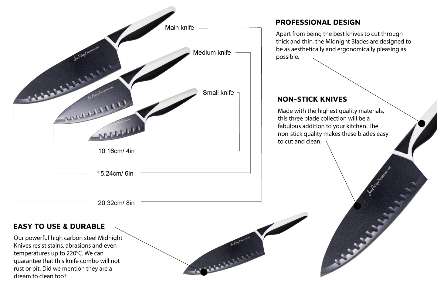• Versatile sizes – Small, medium, and large knives for meats, fish, fruits, and vegetables