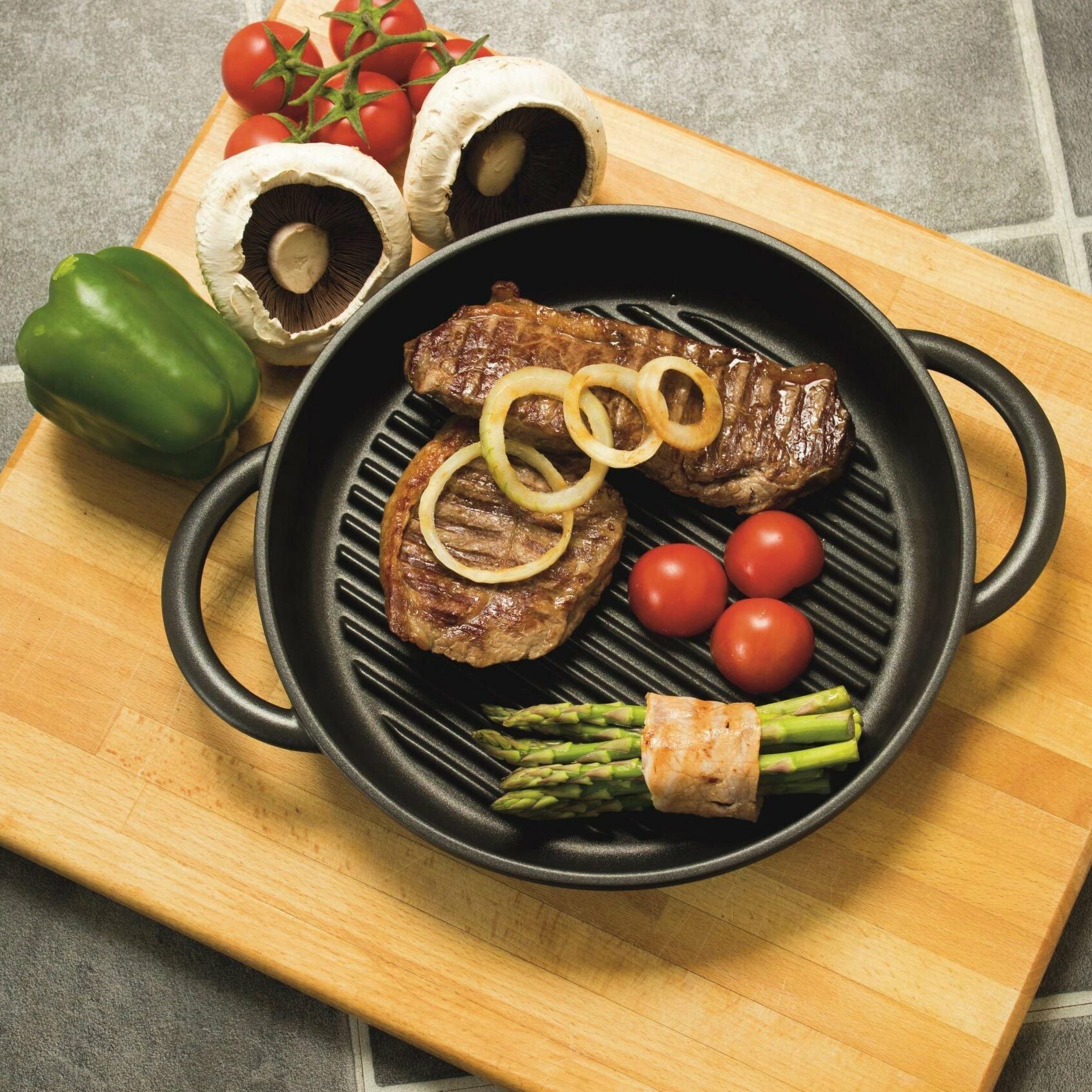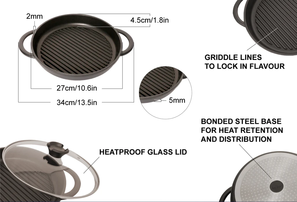 Griddle lines to lock in flavour and extra deep 4.5 cm sides to keep kitchen counters and ovens spotless.
